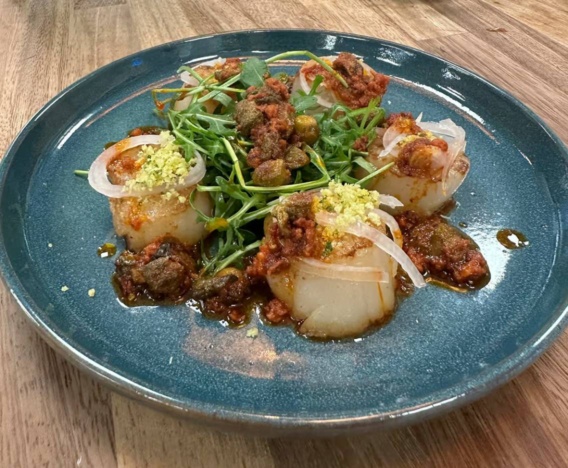 Recipe Scallops & Nduja Butter, Capers & Fresh Lemon 25 Mins 15 Mins Serves 3 Rate this recipe Click to rate: Method Scallops Heat the pan and season scallops, heat the oil and fry the scallops until light brown and slightly caramelised, finish basting with the butter then set to one side. Using the same pan add the Nduja butter, capers and finish with lemon juice. Top the scallops with herb crumb, fresh dressed rocket, pickled shallots and the butter. Herb Crumb Heat a frying pan and add butter, melt and then add the breadcrumbs and cook until lighlty toasted in the pan, remove and leave to cool. Finely chop all the herbs and add to the crumb mix. Set to one side until required.